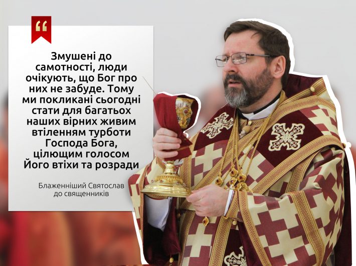 Із вдячністю і подивом споглядаю сьогодні на вашу пастирську ревність за людські душі в цих обставинах великого вселенського болю і загальної тривоги. Особливо мене вразили слова нашого співбрата з Італії, який сказав: «Не боюся померти від цього вірусу! Боюся лише бути носієм цієї хвороби і наразити на небезпеку життя моїх парафіян!» Така ревність і християнська свідомість, навіть стосовно дотримання вимог карантину, у звершенні священничих обов’язків, є виявом готовності пастиря бути поруч зі своїм народом і «покласти душу свою за своїх овець» (пор. Ів. 10, 15). Дякую тим священникам, які записали відеозвернення до наших вірних під гаслом: «Ми з вами!» Радію з того, що ви тужите за живим спілкуванням зі своїми людьми та шукаєте всіх можливих шляхів, аби бути з ними та дати їм можливість відчути вашу турботу і молитву. З особливою вдячністю згадую сьогодні тих із наших душпастирів, які здійснюють довірене їм служіння на передових позиціях сучасних українських фронтів – медичних і військових капеланів. Я переконаний, що ці нові обставити дозволять нашому народові краще пізнати й полюбити свою Церкву, а через ваше служіння – глибше довіритися Господу Богу.